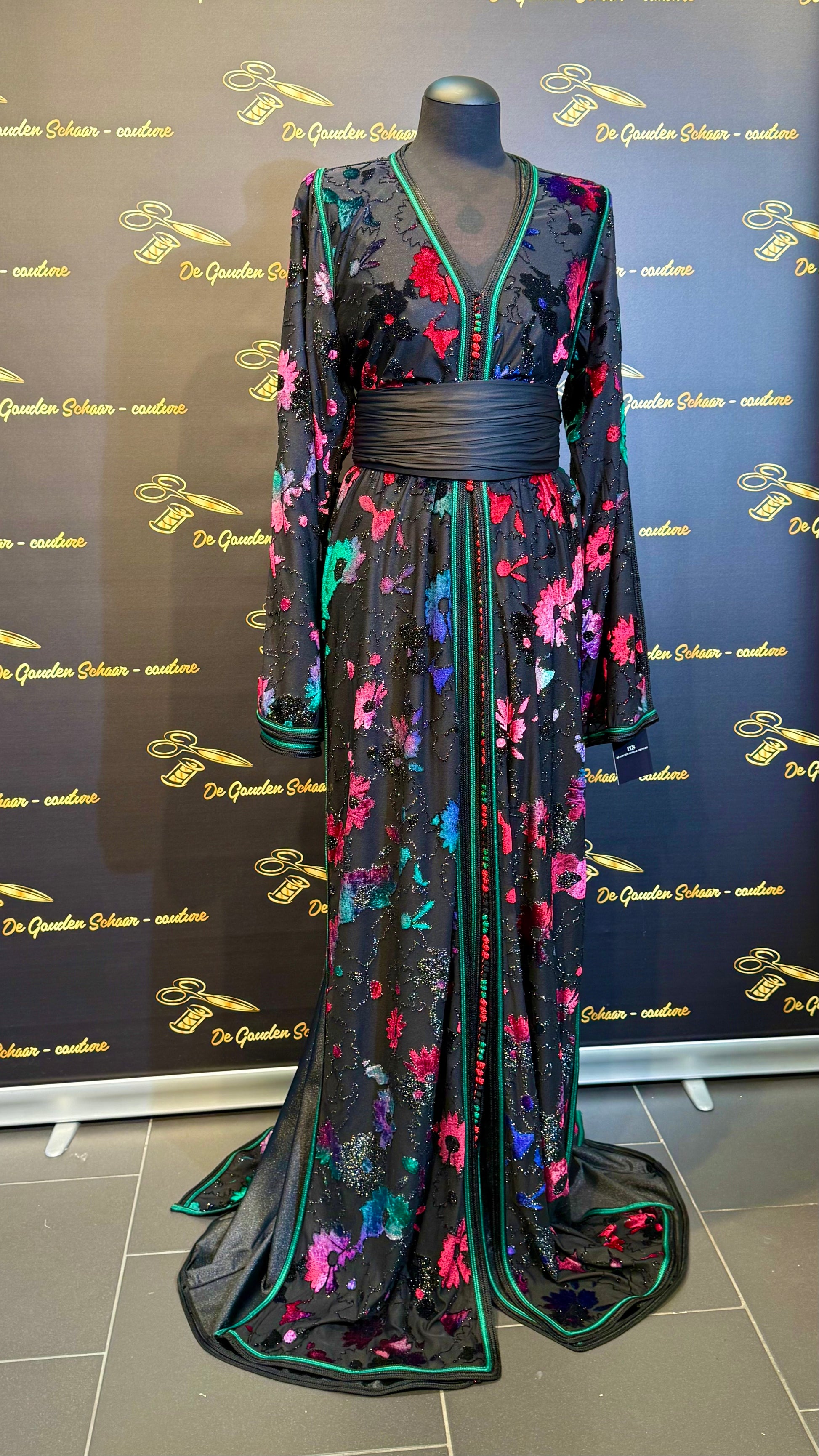 Zwarte basis met kleurrijke bloemen: De jurk heeft een zwarte achtergrond die rijkelijk is versierd met kleurrijke geborduurde bloemen in rood, paars, blauw, groen en roze. Dit zorgt voor een speels en levendig contrast.