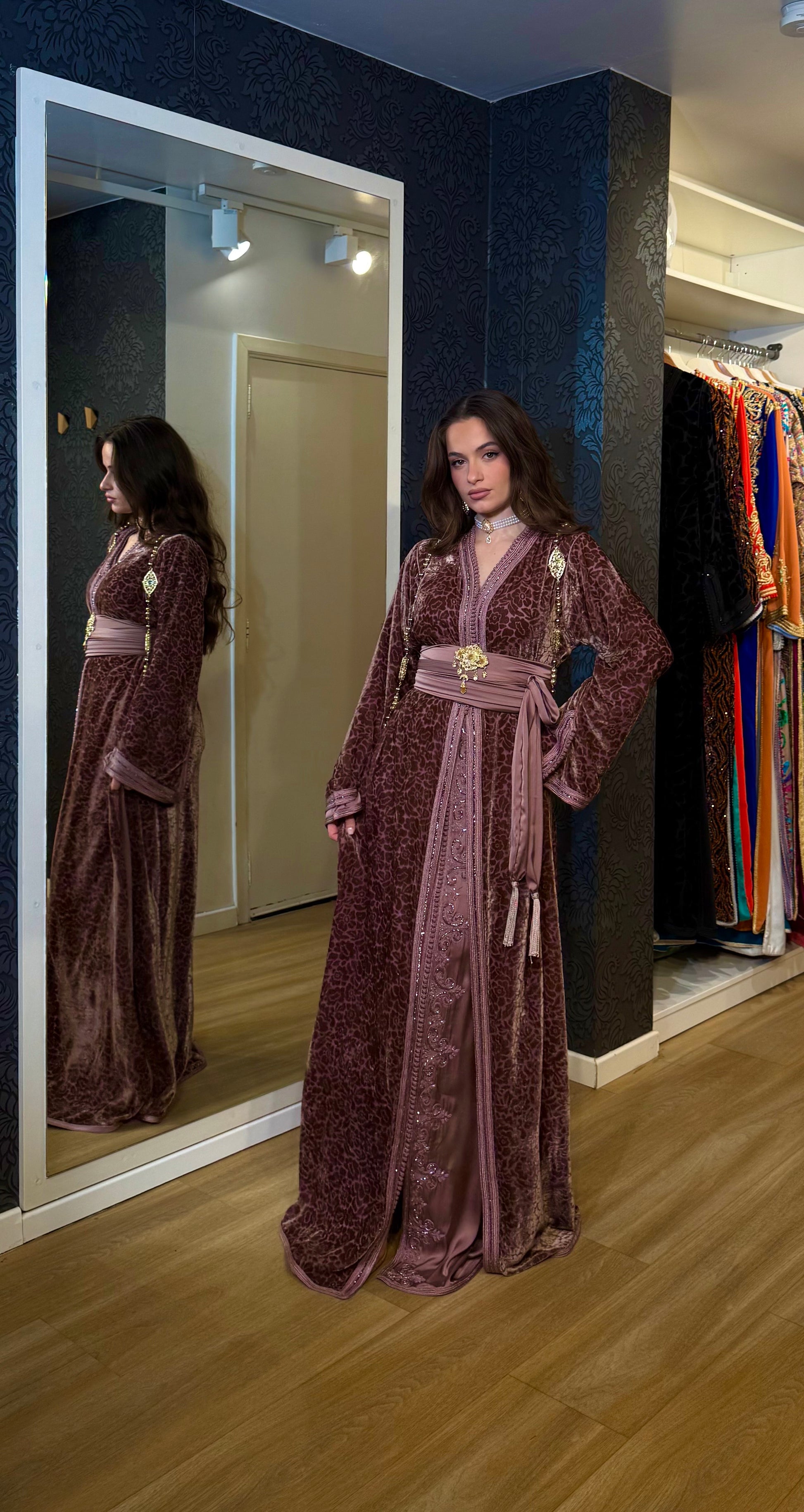 Wij bieden Marokkaanse haute couture-creaties aan, waaronder kaftans , chakitas en jellaba's . Elk stuk is uniek en gemaakt met voorouderlijke knowhow.