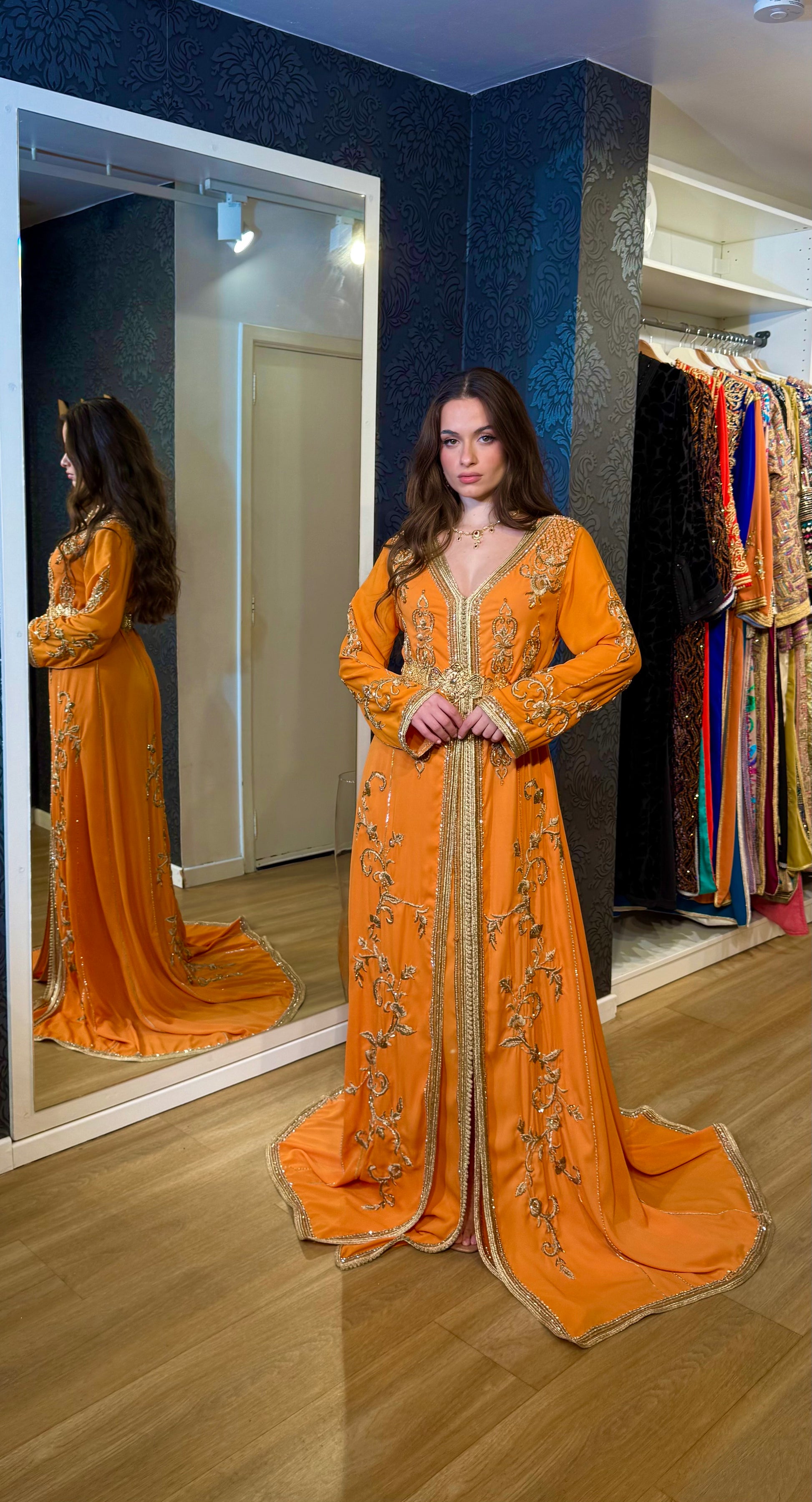 Kleurrijke elegantie: De oranje jurk straalt warmte en luxe uit.